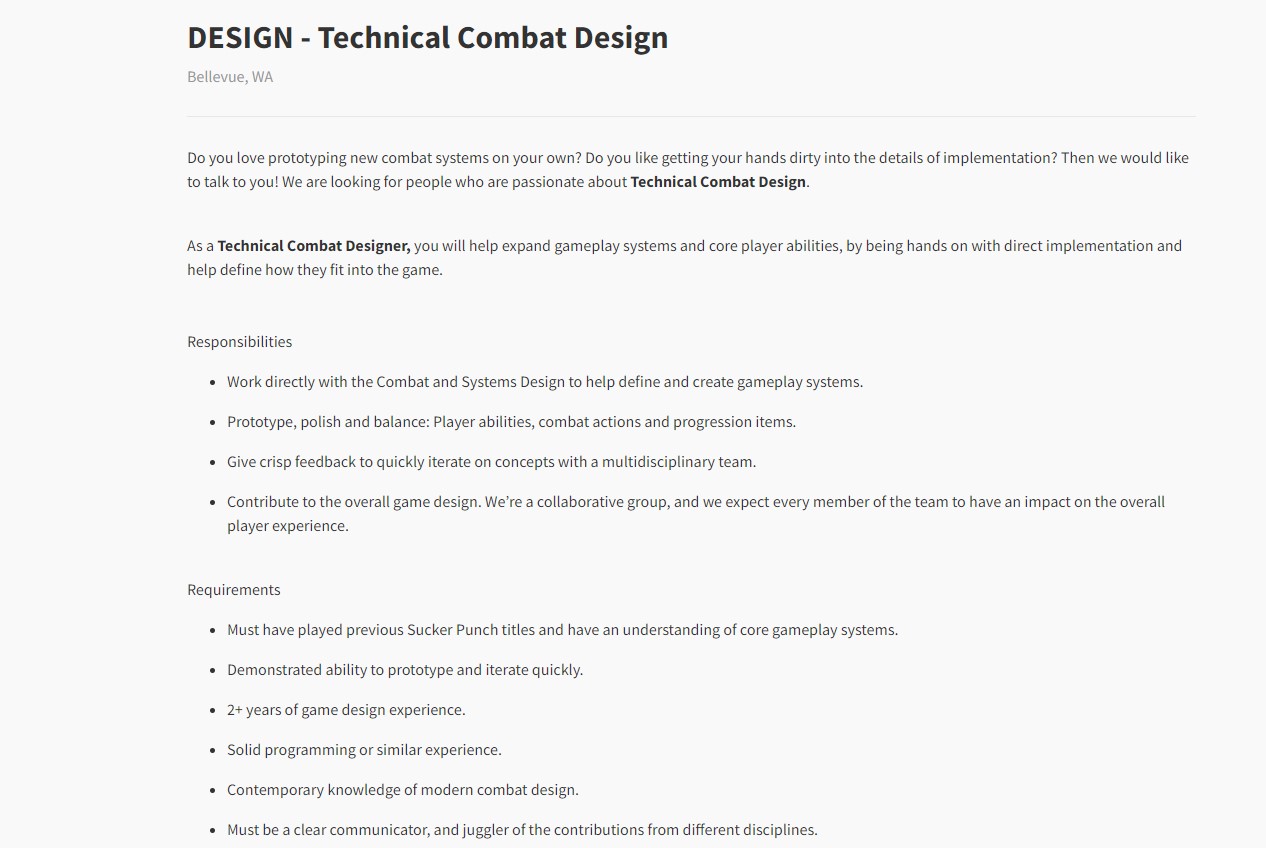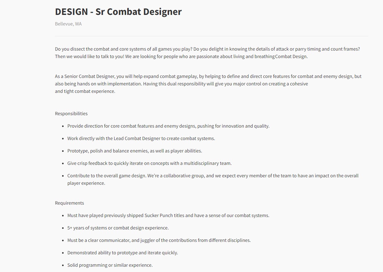 There are two job listings, one for a Senior Combat Designer and the another for Technical Combat Design that include some very interesting descriptions. Both of these posts require the developers to have “played previously shipped Sucker Punch titles” which right away tells us that this is a new game in an established franchise.