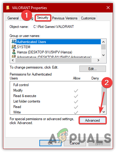 - Not Having Security Permissions- The authenticated users is the default security permission of the Valorant folder. However, it may cause issues as your user account is not selected. For that reason, the Riot Client may not read and overwrite the existing game files.