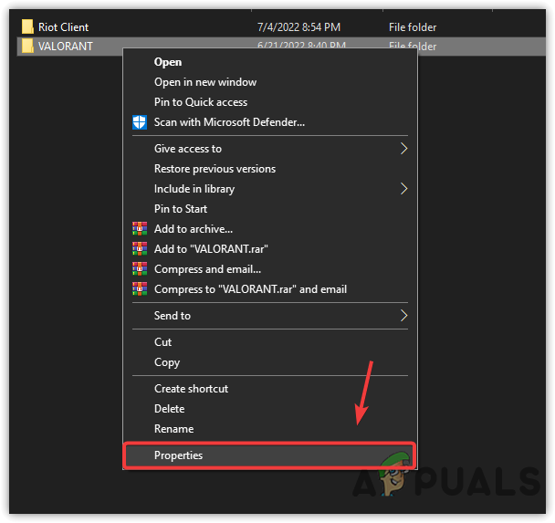 Note: If you have installed it in another destination, navigate to it - Right-click on Valorant folder and select Properties