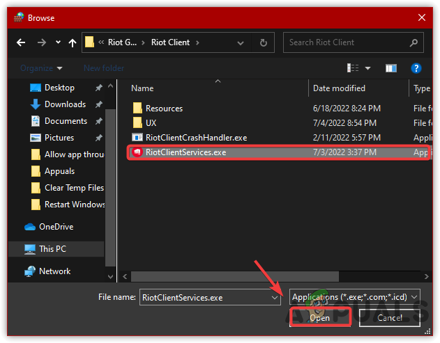 Selecting the .exe File of Riot Games - Once done, the Riot Client has been added to the firewall. Additionally, you can tick the boxes under Private and Public
