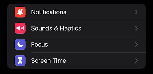 It is between Sound & Haptics and Screen Time. Tap on it, and it will take you to its settings page, where you can adjust your distraction measures. You can silence notifications and contacts.