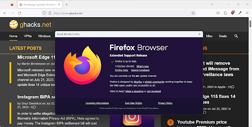 Firefox ESR installations may be upgraded to the new version by selecting Menu > Help > About Firefox. This opens a small popup that displays the current version. Firefox checks for updates whenever the page is opened and the new Firefox 115.0.3 ESR update should be downloaded and installed.