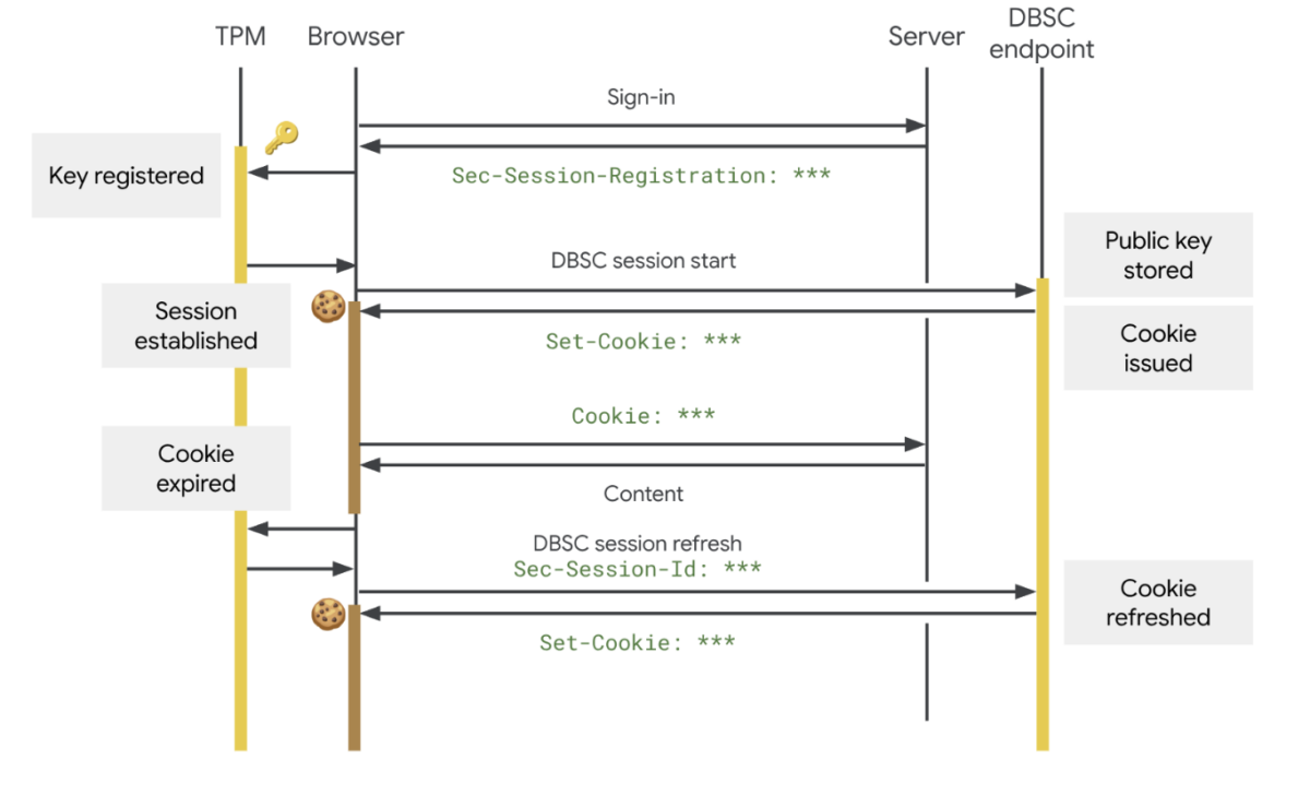 DBSC links a user's browser session to the device's security hardware, which is the Trusted Platform Module on Windows and the Secure Enclave on macOS. During session creation, the security chip generates a unique pair of public and private keys.